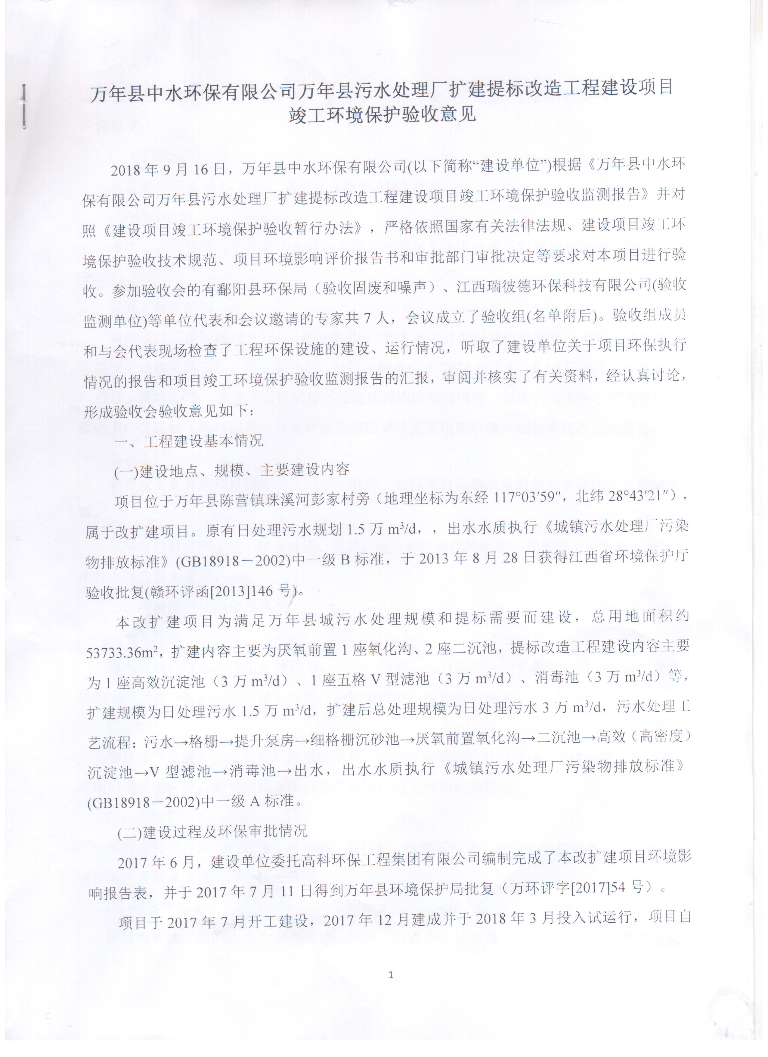 2018年9月16日,萬年縣中水環保有限公司組織召開“萬年縣污水處理廠擴建提標改造工程項目竣工環境保護驗收會”。參加驗收會的有鄱陽縣環保局(驗收固廢和噪聲)、江西瑞彼德環??萍加邢薰荆炇毡O測單位)等單位代表和會議邀請的專家共7人。與會代表及專家會前現場檢查了工程環保設施的建設、運行情況,會上聽取了建設單位關于項目環保執行情況的報告和項目竣工環境保護驗收監測報告的匯報,審閱并核實了有關資料,經過認真討論,驗收組認為萬年縣中水環保有限公司萬年縣污水處理廠執行了環境影響評價制度,項目建設過程中落實了環評報告及批復的要求,嚴格執行了“三同時”制度,各類污染物監測結果符合相關驗收排放要求,因此,該建設項目驗收合格,現特此進行公示。